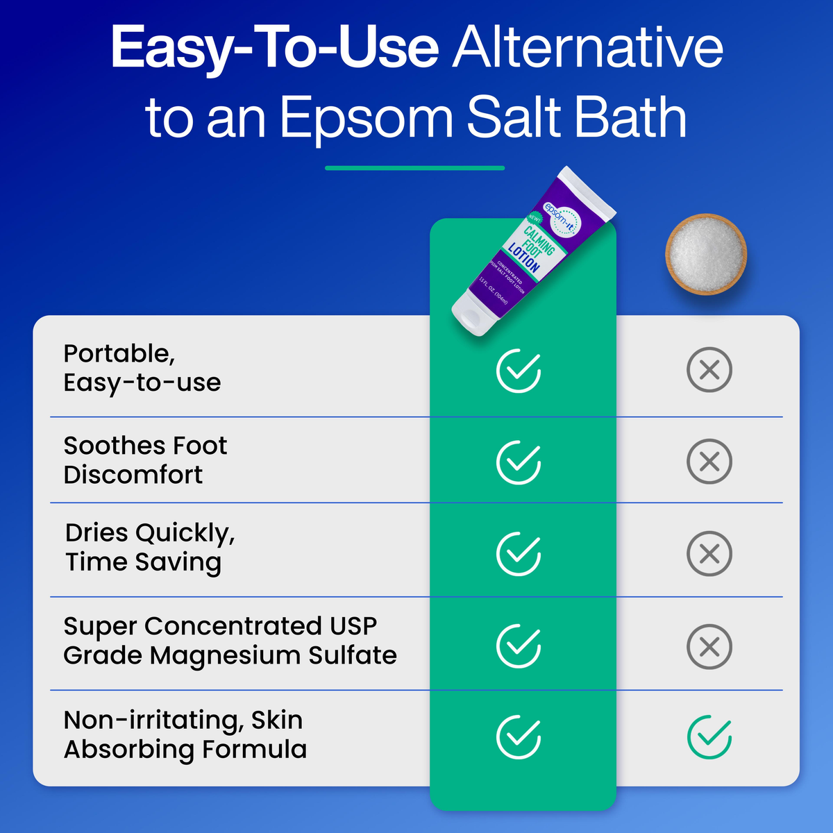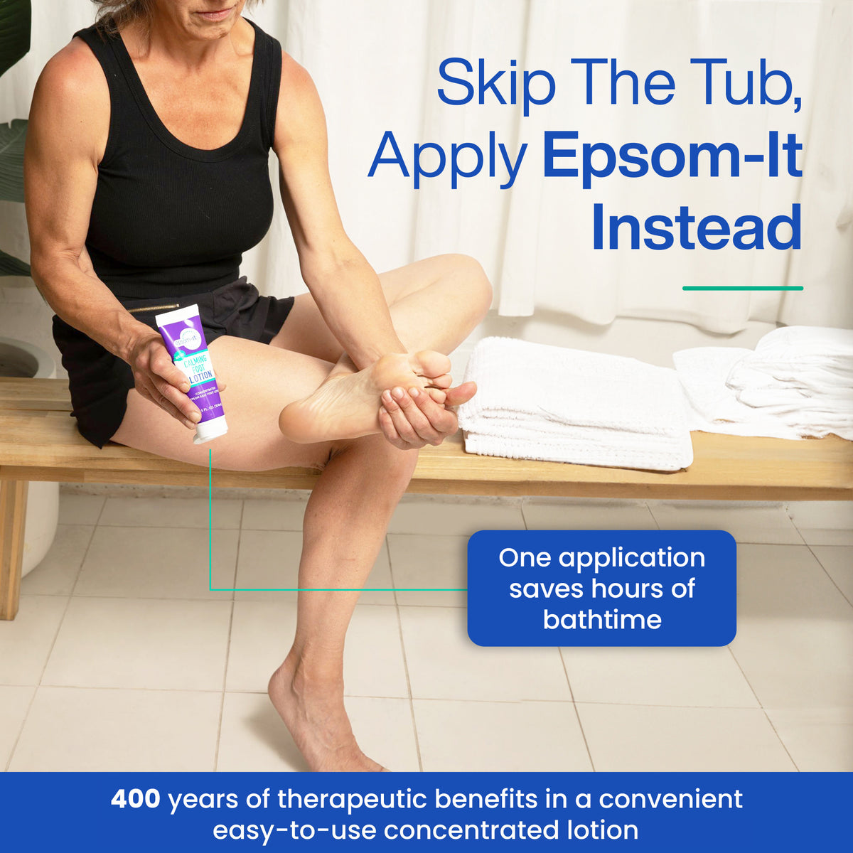 • Skip the foot soak and experience the comfort of Epsom Salt in a foot lotion. Epsom-It Calming Foot Lotion is 30X more concentrated than a traditional Epsom Salt foot soak, featuring a 20% concentration of 100% pure USP Grade Magnesium Sulfate. Enhanced with natural Urea, this topical magnesium sulfate lotion penetrates deep below the skin to provide comfort for tired and achy feet, ankles, leg cramps, and the sensation of restless legs after a long day of standing or strenuous activity.